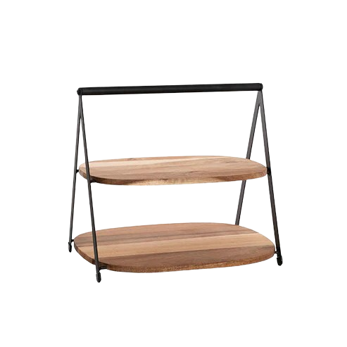 Showcase your cheeses and treats in style with this Acacia Wood 2-Tier Display Stand in Brown. Featuring a sleek black metal frame for a modern touch, this tiered stand displays two wooden boards; one large, and one medium. Offering plenty of space for cheeses, desserts, and other delicious bites, this stand is perfect for entertaining and maiximising space on table displays.