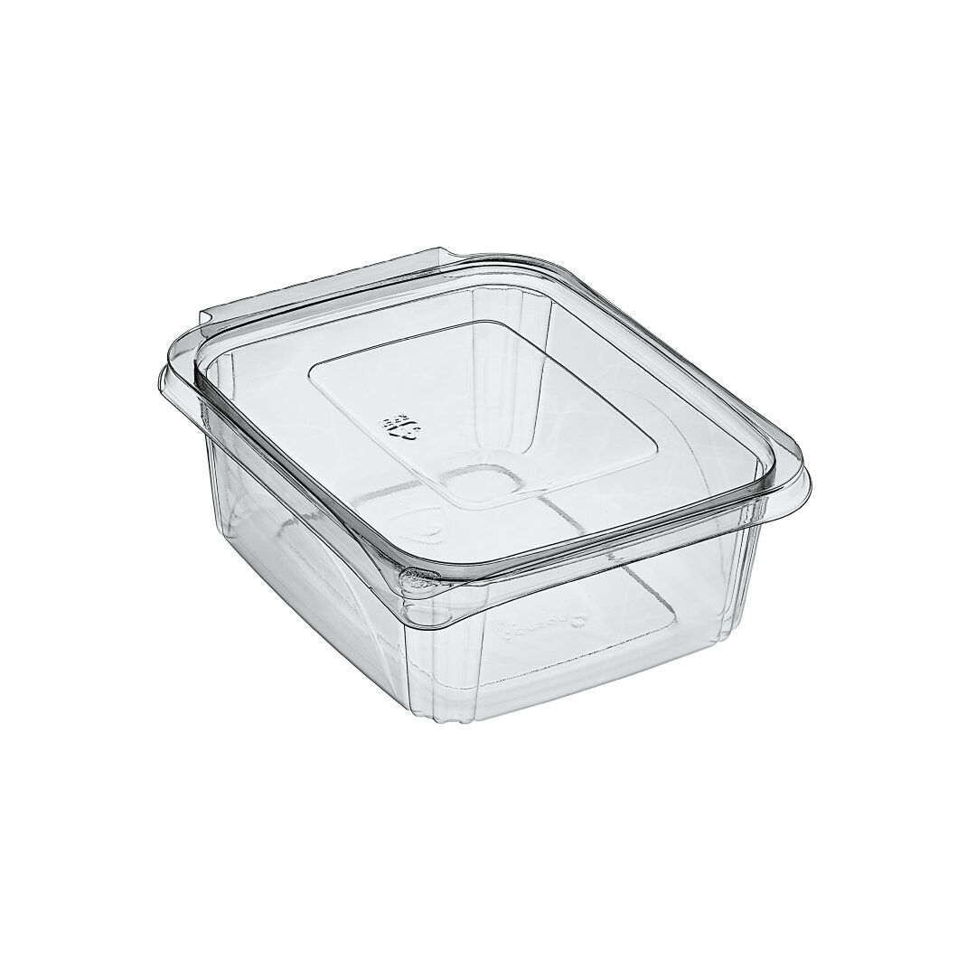 Made with recycled PET material, the container features exceptional clarity that enhances food presentation.